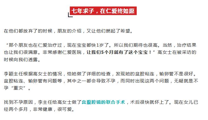 幸运的是,七年的坚持与不放弃,在仁爱李颖主任的治疗下,一举解决了缠绕于她身上多年的两种不孕症状,生下了一个千金宝贝,真是可喜可贺!